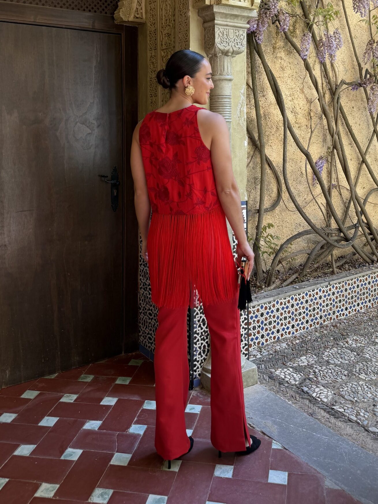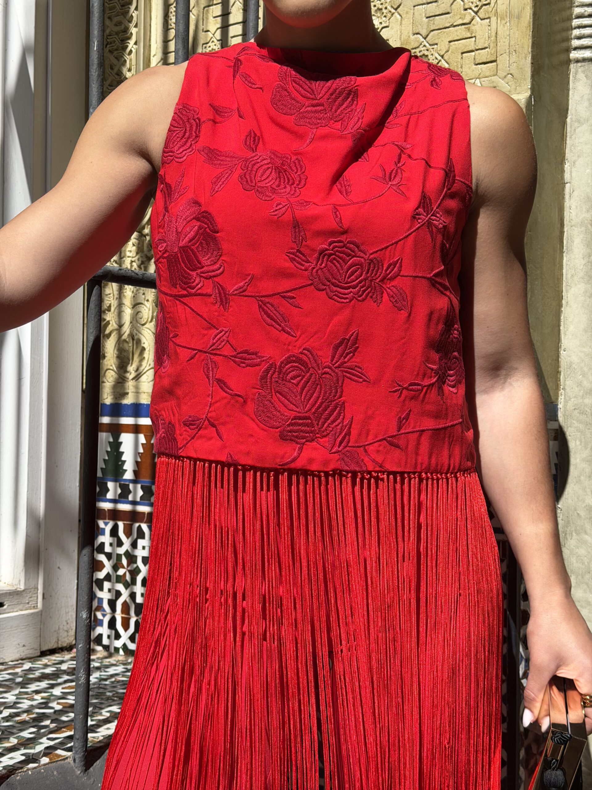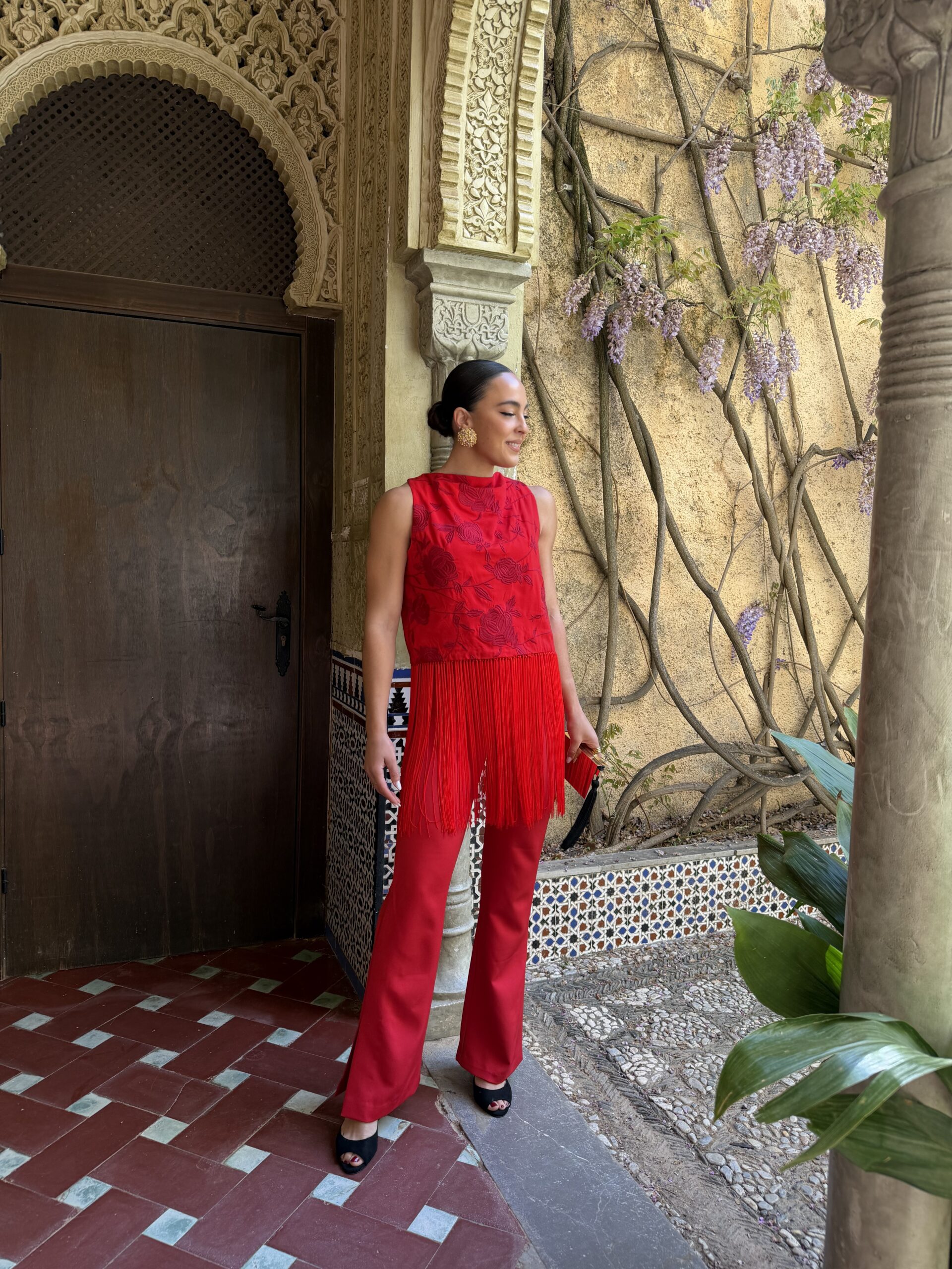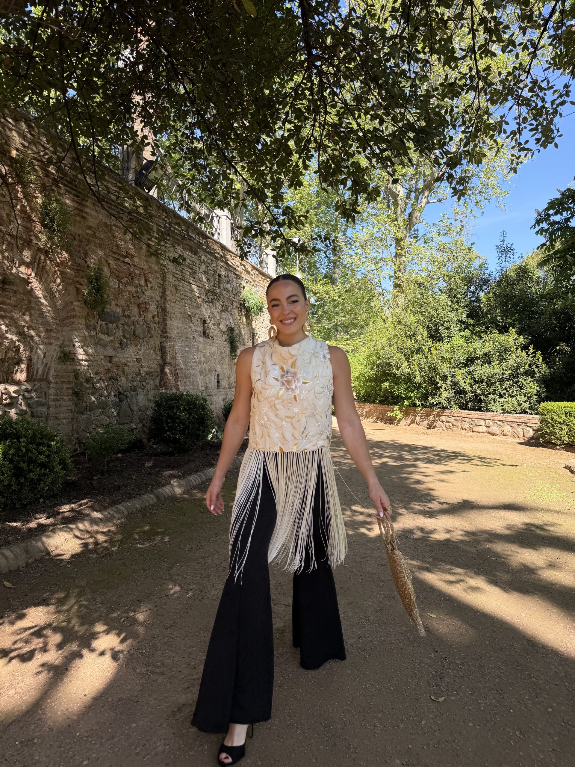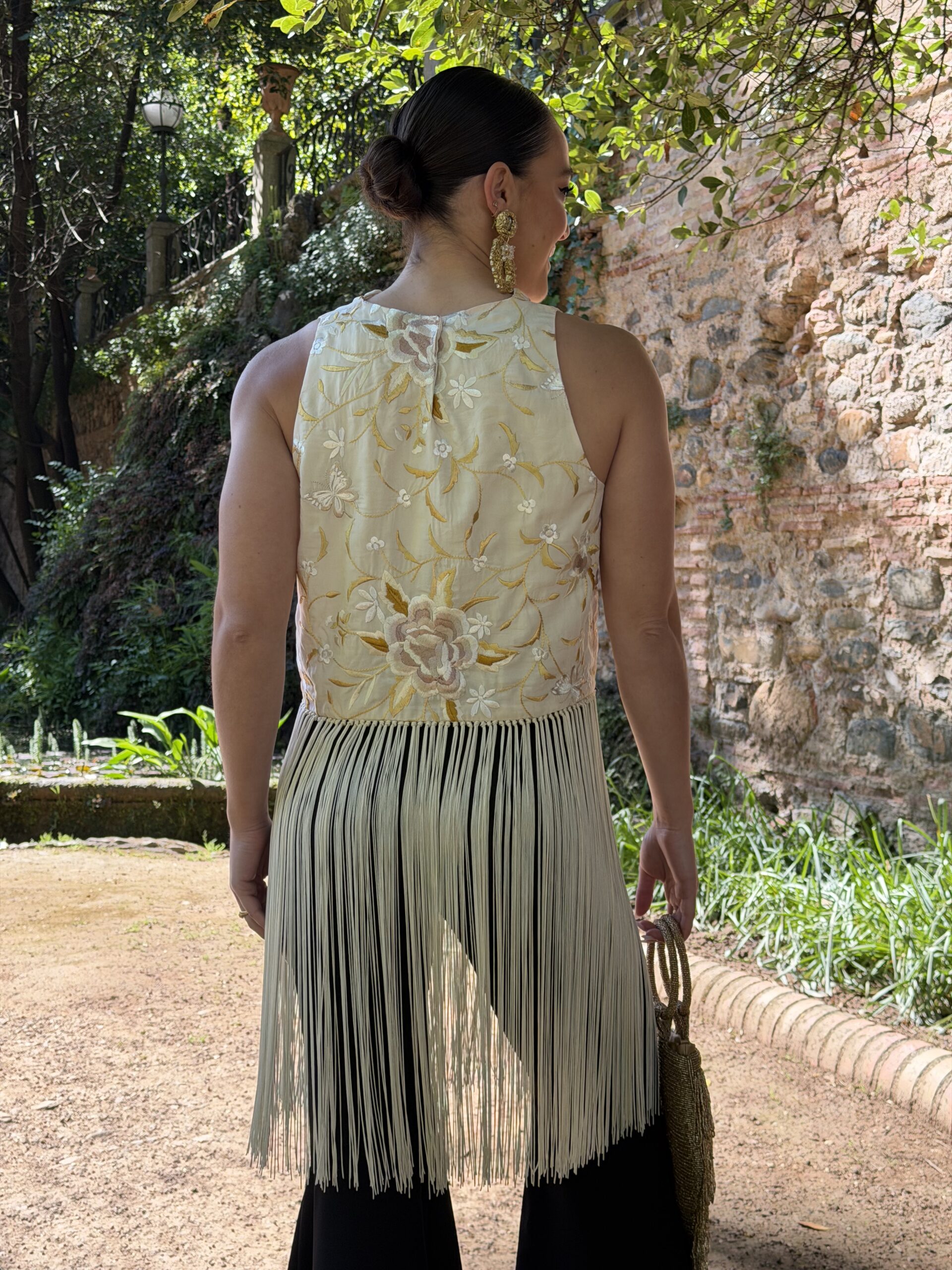 A partir de la cintura, los flecos anudados cobran protagonismo, generando un movimiento sutil al caminar que lo convierte en una prenda especial, con carácter. Es ese tipo de top que transforma un conjunto sencillo en algo mucho más sofisticado.